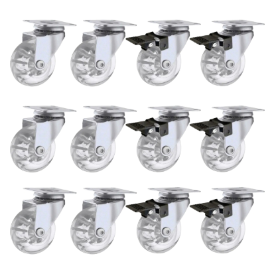 Kit 12 Rodízios 50mm em Silicone Gel – 6 com Trava + 6 sem Trava | Base Cromada com Chapa Metálica Mais mobilidade, segurança e silêncio para seus móveis! Este kit com 4 rodízios de 50mm é ideal para armários, estantes, bancadas, racks e até frigobares. Com estrutura reforçada e acabamento cromado, proporciona deslizamento suave e silencioso em pisos lisos, sem riscar ou travar. O que vem no kit: • 6 rodízios com trava • 6 rodízios sem trava • Roda em silicone gel anti-risco, transparente • Base cromada com chapa metálica 38x38mm com 4 furos • Altura total do rodízio: 7,2 cm Benefícios: • Roda de silicone gel: silenciosa e segura para porcelanato, madeira, vinílico e laminado • Suporte para móveis de madeira ou metal • Fixação com parafusos (não inclusos) • Ideal para mobília residencial, comercial ou industrial leve • Fácil de instalar – basta parafusa